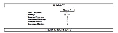 The next two sections, shown above, show the summary average and summary units completed for the quarter. The section also shows any absences/tardies and teacher comments related to your student.