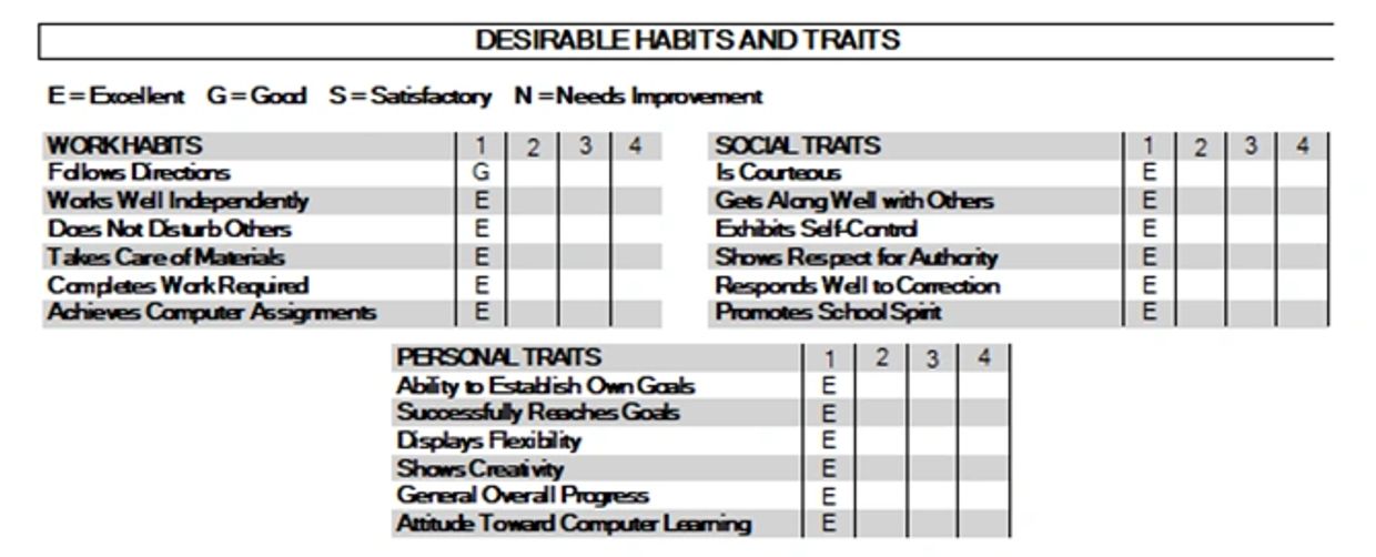 The final section of the Report Card shows the teacher’s review of your student’s behavior and participation and should be self-explanatory.