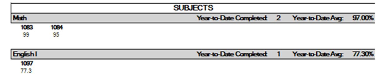 In the above image, you can see several critical pieces of information. The title of each subject is displayed in the gray line with the grades achieved beneath. Each number represents either a PACE completed or a computer unit. The “Year-to-Date Completed” number shows you how many PACEs or computer units have been completed as of the Report Card. At this point, your student should have completed 3 PACES (some high school subjects are longer and may reflect only 2 PACES at this point) and/or 2-3 computer units. If your student has less than this, she or he is most likely behind, but may not be significantly so.